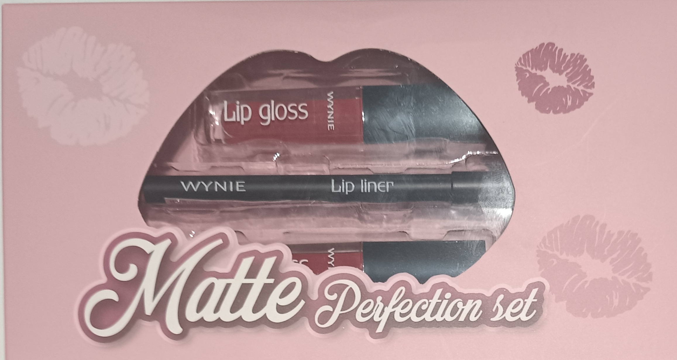 Set de maquillaje para labios e la marca Wynie que incluye: un delineador de labios, un brillo de labios y un labial líquido mate.