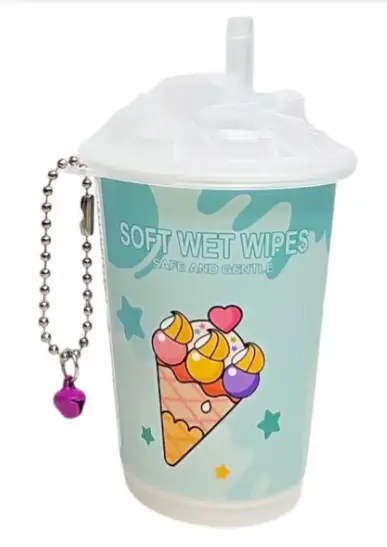 Preciosa y divertida vaso de refresco, con tapa que simula una pajita y cubitos de hielo con preciso diseño kawaii de un helado, con toallitas húmedas en su interior.