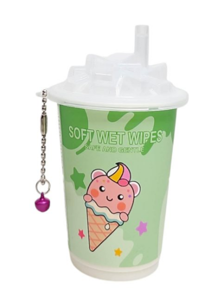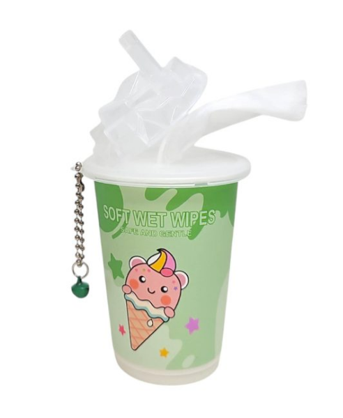Preciosa y divertida vaso de refresco, con tapa que simula una pajita y cubitos de hielo con preciso diseño kawaii de un helado, con toallitas húmedas en su interior.